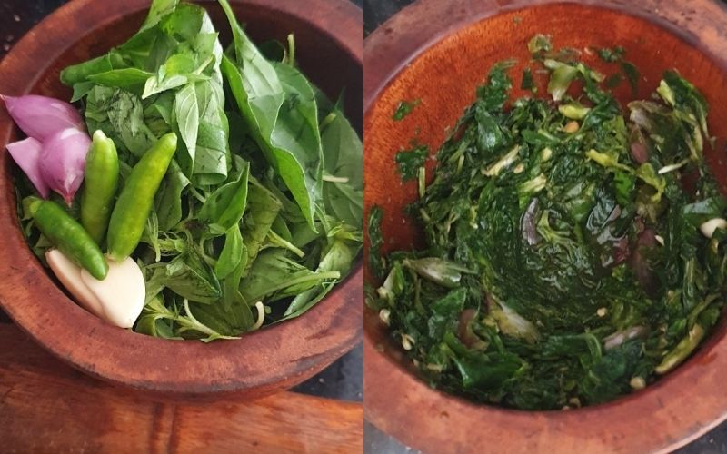 Add about half of the basil leaves.mortarAlong with 3 cloves of garlic, 3 shallots, and 2 chili peppers. Use a mortar and pestle to grind the ingredients together until well combined, helping to release the essential oils in the basil leaves. Keep the remaining basil leaves whole to add to the hot pot when eating, to make the dish more fragrant.