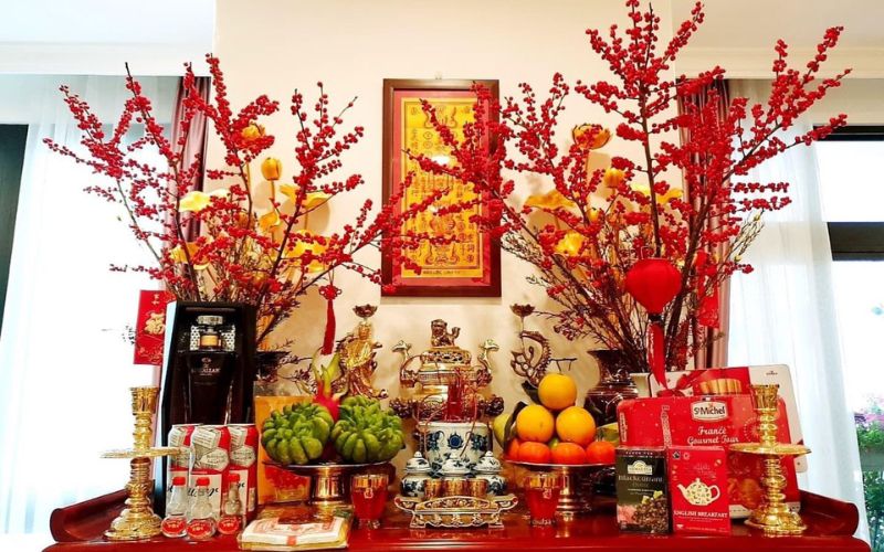 To create a harmonious worship space, homeowners can decorate the altar for Tet (Lunar New Year) with various items that symbolize good fortune. like: