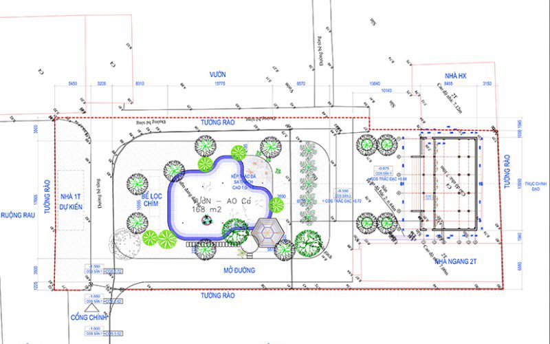 - Cây xanh và tiểu cảnh: Việc bố trí cây xanh, thảm cỏ, hồ nước hay thác nước nhân tạo đều được thể hiện rõ trong bản vẽ. Những yếu tố này mang lại sự mát mẻ, gần gũi với thiên nhiên, đồng thời nâng cao giá trị thẩm mỹ cho không gian.
