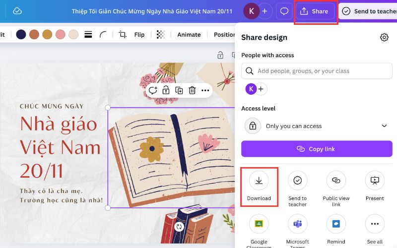 Khi hoàn tất, nhấn “Tải xuống” để lưu thiệp dưới dạng hình ảnh PNG hoặc PDF chất lượng cao. Ngoài ra, bạn cũng có thể chia sẻ trực tiếp qua email, Facebook hoặc Zalo để gửi lời tri ân đến thầy cô.