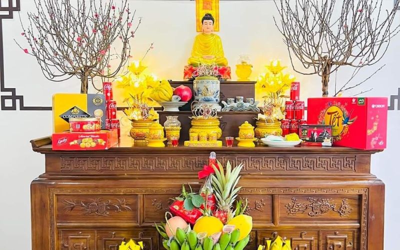 Để không gian thờ cúng thêm hài hòa, gia chủ có thể trang trí bàn thờ ngày Tết bằng nhiều vật phẩm mang ý nghĩa may mắn như: