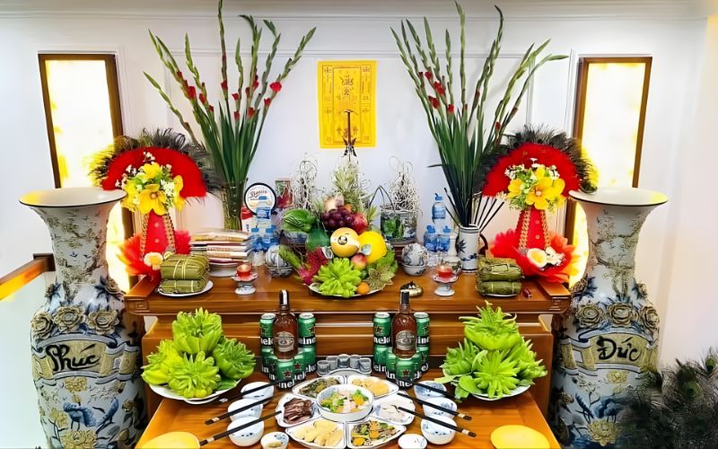 - Mâm lễ vật: Thường gồm bánh chưng xanh, giò chả, xôi gấc và các món ăn truyền thống. Các lễ vật thể hiện lòng thành kính và mong cầu một năm mới sung túc, đủ đầy.
