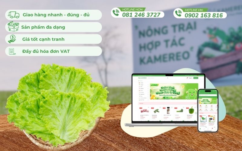 Với nền tảng đặt hàng hiện đại trên web và ứng dụng, Kamereo cho phép doanh nghiệp dễ dàng đặt mua rau củ, thịt cá, gia vị, theo dõi đơn hàng và quản lý nhiều chi nhánh trên cùng một hệ thống. Nhờ đó, bếp ăn có thể duy trì nguyên liệu ổn định để triển khai các món như salad rau xà lách, món ăn hàng ngày hay thực đơn healthy một cách linh hoạt và hiệu quả.