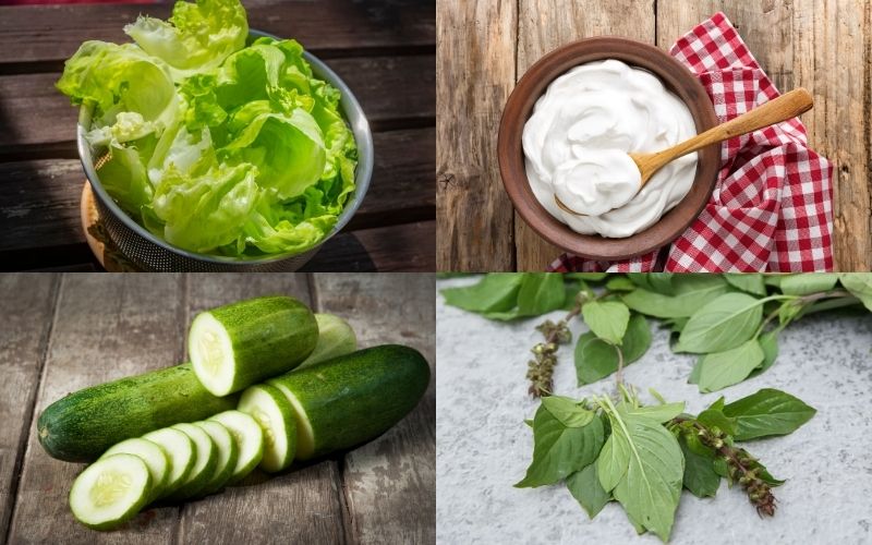 Cho xà lách, dưa chuột và lá húng quế vào đĩa lớn. Rưới sữa chua lên trên, trộn nhẹ tay để các nguyên liệu áo đều sốt mà không bị nát. Khi ăn, đảo lại một lần nữa là có thể thưởng thức ngay.