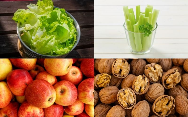 Cho rau xà lách, cần tây và táo vào tô lớn, rưới phần sốt lên và trộn nhẹ tay. Cuối cùng rắc hạt óc chó lên trên, trộn đều lần cuối trước khi dùng.