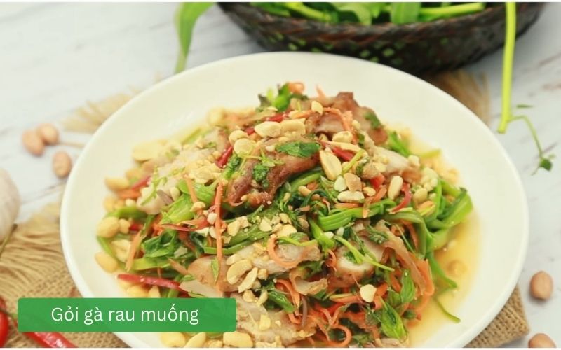 - Pha và trộn nộm: Pha nước trộn từ nước mắm, đường, nước cốt chanh và gia vị sao cho chua ngọt hài hòa. Bạn cho rau muống, thịt gà và hành tây vào tô lớn, rưới nước trộn lên rồi trộn đều tay cho thấm vị. Cuối cùng, rắc thêm đậu phộng rang và rau răm, trộn nhẹ lần nữa rồi bày ra đĩa và thưởng thức.