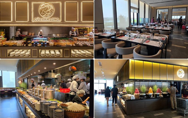 Không gian tại Cửu Vân Long được thiết kế theo phong cách Indochine tinh tế và hiện đại, vừa giữ nét sang trọng vừa tạo cảm giác thân thiện. Diện tích rộng lớn cùng cách bố trí buffet khoa học giúp khách dễ dàng di chuyển giữa các quầy món ăn, dù quán đông vào giờ cao điểm như cuối tuần hoặc dịp lễ. Đội ngũ phục vụ ở đây được đánh giá là nhiệt tình và sẵn sàng hỗ trợ thực khách trong suốt bữa buffet từ giới thiệu món đến thêm đồ ăn tại các line hải sản khi cần thiết.